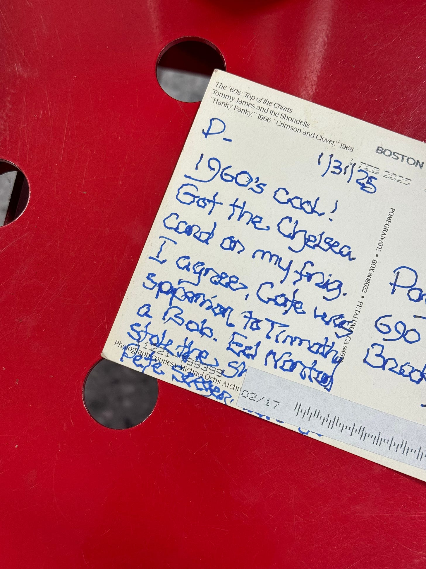 Transcription: P- 1960s cool! Got the Chelsea card on my frig (sic). I agree, Cate was superior to Timothy as Bob. Ed Norton stole the show as Pete Seeger. Love, GL