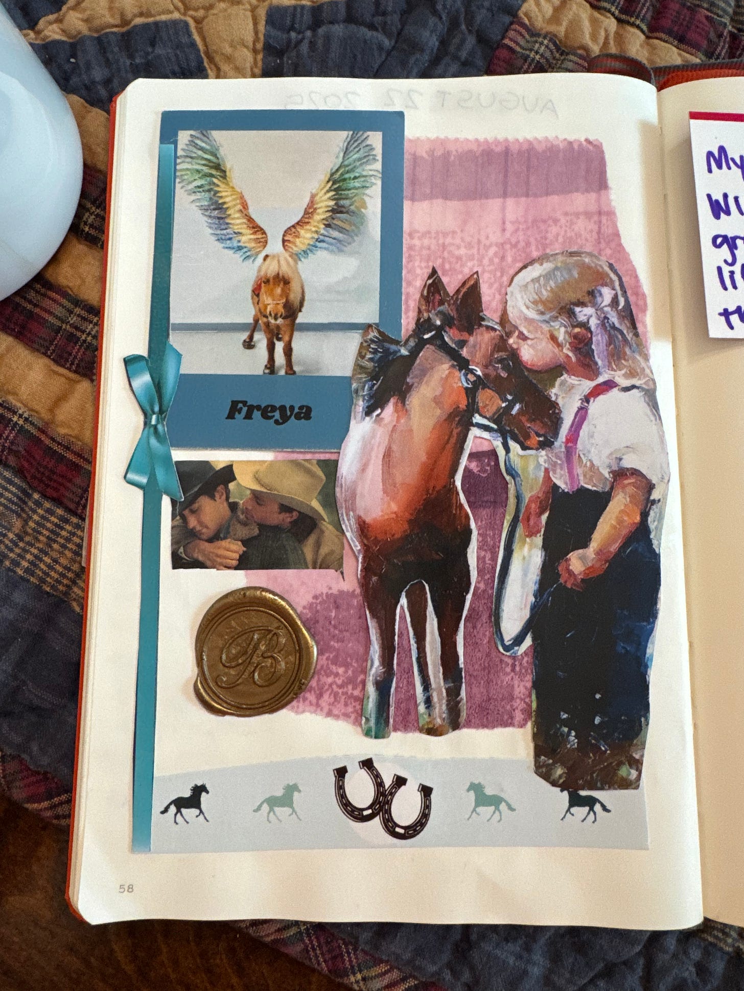 Most of the time I keep the things I pick up. For example, I was given a Freya the Mini Pony trading card after riding horses at East of Eden Stables in Presque Isle, Maine. Freya is sort of their mascot. She has made appearances at the library, the hospital, and the elementary school. The wax seal is from my best friend Kacie and her husband Alex’s wedding invitation. I think I found that cheeky Brokeback Mountain image in the New Yorker.